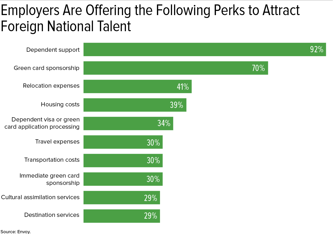 Employers include the following perks to attract foreign national talent, according to the survey: